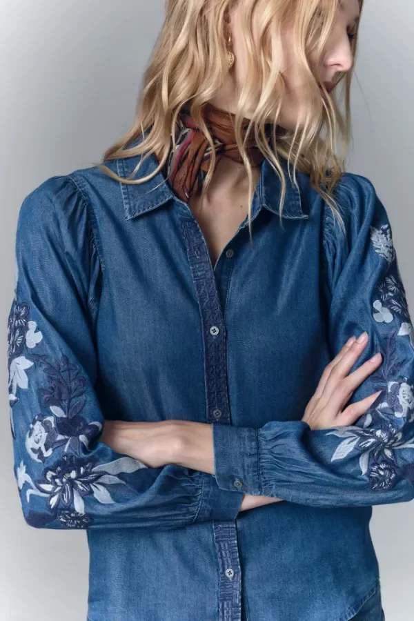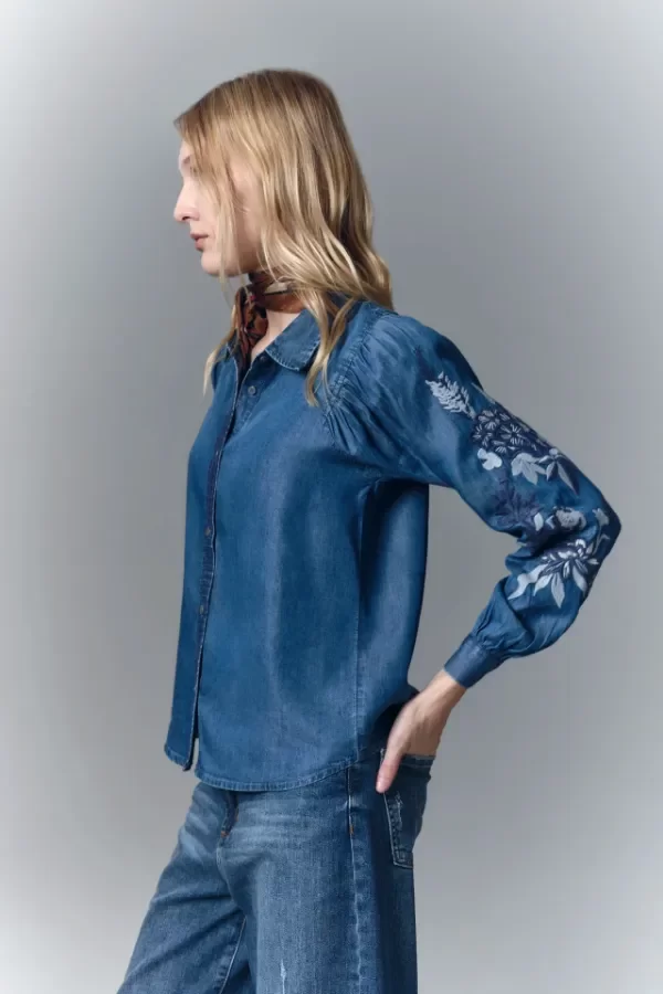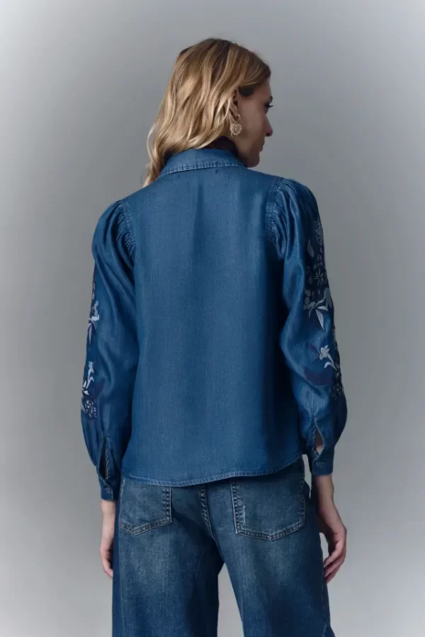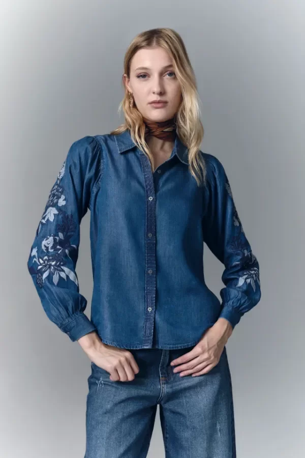Camisa de calce recto, con manga larga amplia con frunces en los hombros y cuello camisero. Confeccionada en tencel, con bordado de hilo en mangas y cartera. Mangas terminadas en puño con botón y ojal. Cartera delantera con botones metálicos con el logo de la marca. Hecho en India.