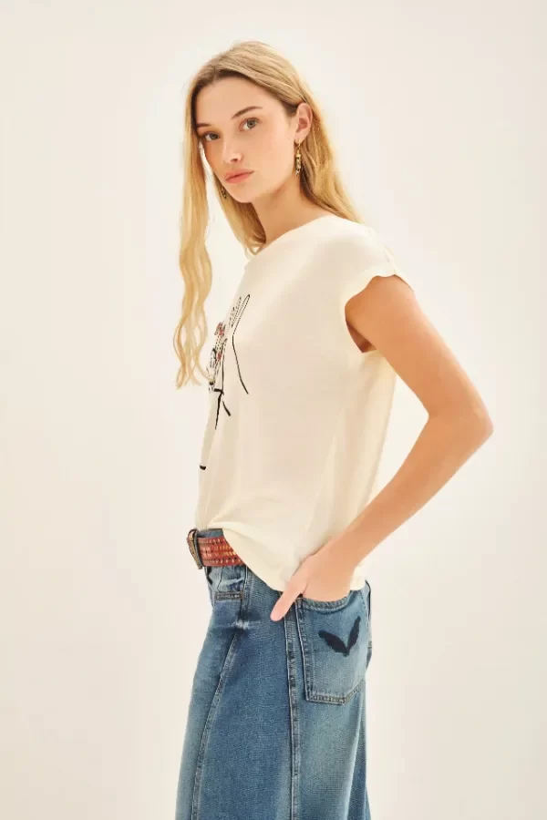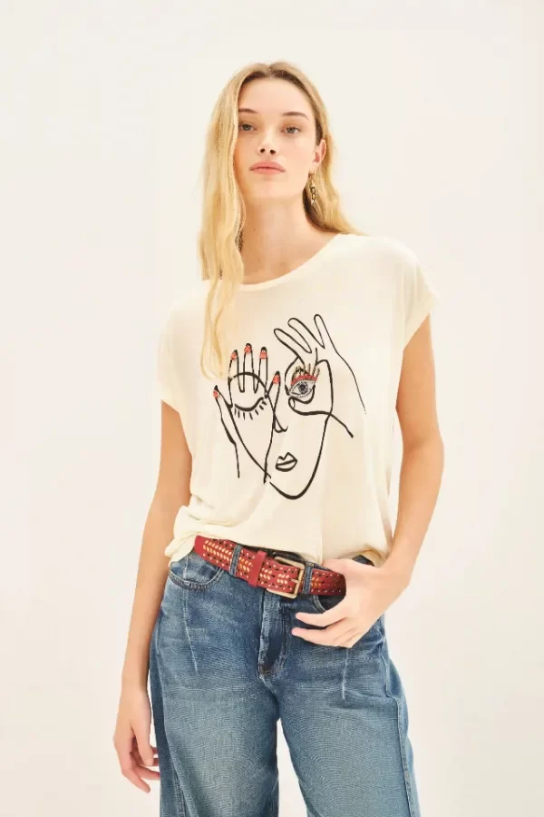 Remera básica de calce suelto en viscosa con escote redondo y manga corta. Con estampa frontal centrada y bordado. Lleva medallita marcaria en la espalda