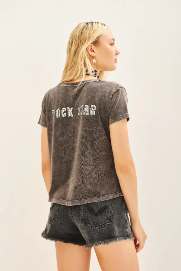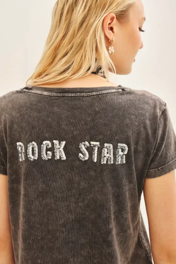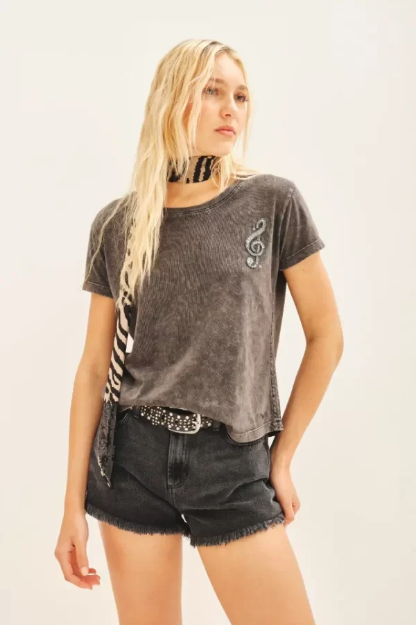 Remera de calce al cuerpo, confeccionada en jersey 100% algodón, con lavado laser. Bordado en el delantero y espalda, de inspiración musical y rockera, con mostacillas y lentejuelas.